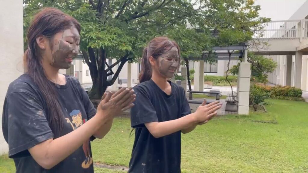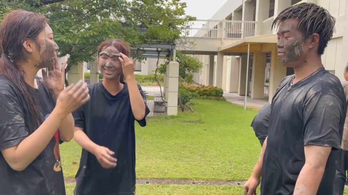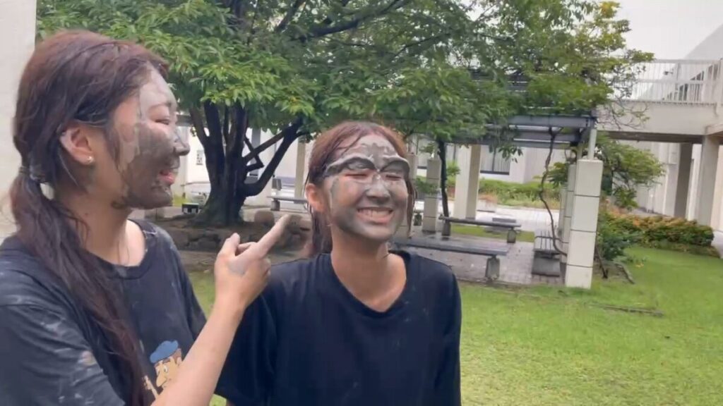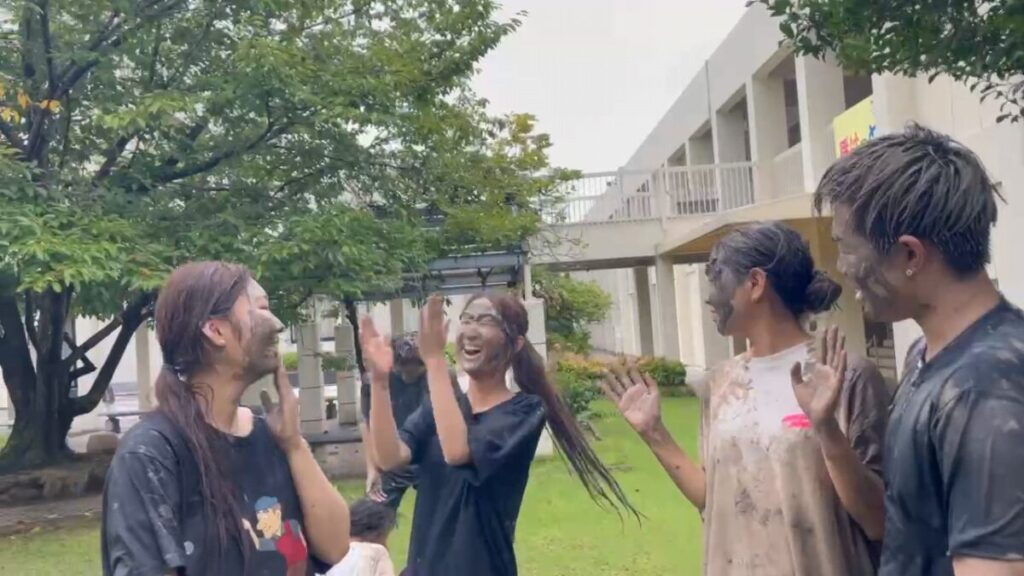 大学に戻り、さてこのドロをどうしようか思案していると、いつの間にか学生達がドロで遊び始めていました。子どもたちの活動を間近で観ていたことで、童心が刺激されたのか、お互いにドロを塗り合って喜んでいました。