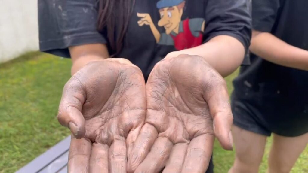 保育を学ぶということは、自分の子ども時代を思い出すことでもあります。学生達もドロを触りながら、小さい頃にこんな風に遊んでいたな、と思い出したのかもしれません。まるで子どものように朗らかに笑い合っていました。