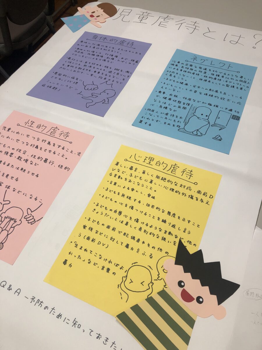 これまでゼミでは、「どのような活動か」「子どもの虐待とは」「虐待の現状」などについて調べ学習を行ってきました。さらに、保育学科の学生を対象に、児童虐待に対する認識や取り組みについてアンケート調査を実施し、その結果もあわせて展示する予定です。