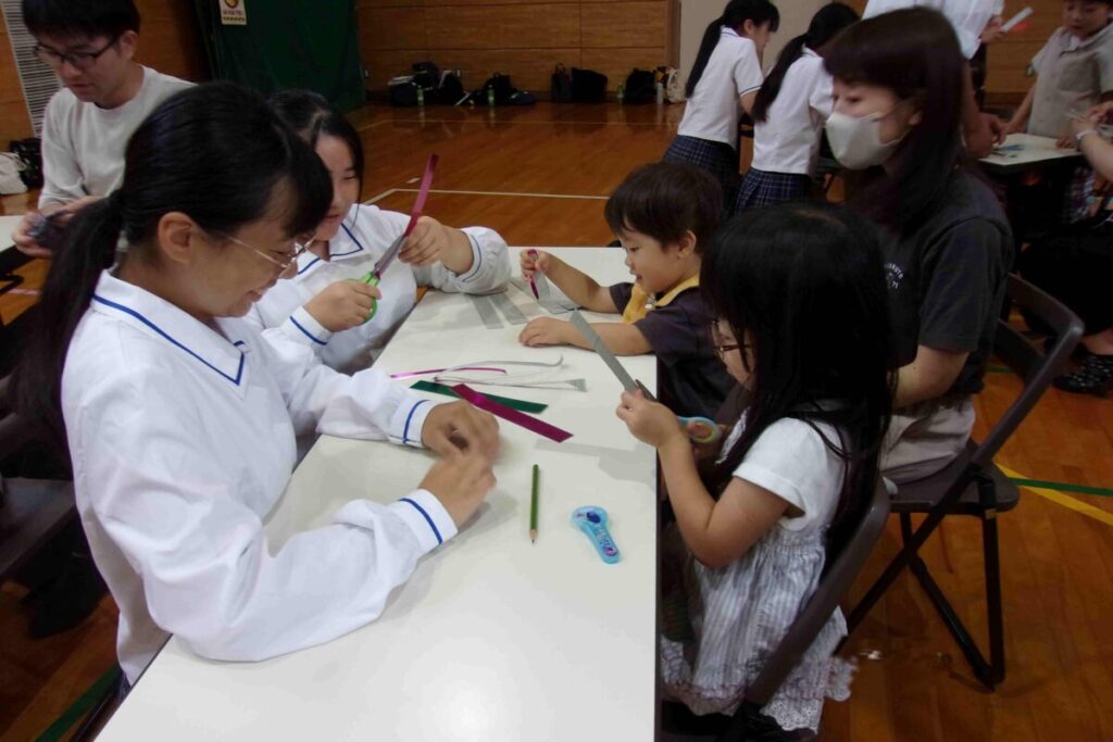 先日の活動では、本学保育学科の2年生や卒業生などが中心となって企画、活動し、高校生と協力しながらいろいろな遊びやモノづくりなどを子どもたちと一緒にしました。