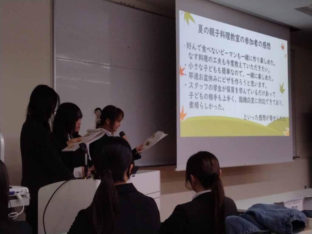 本学は、「野菜で子育て支援~地域に広げる食育活動について~」のテーマで、夏の「親子料理教室」や10月の大学祭、11月に行った地域の集会室や畑での「収穫祭」等、自分たちで企画・運営した親子活動についてまとめて発表しました。
