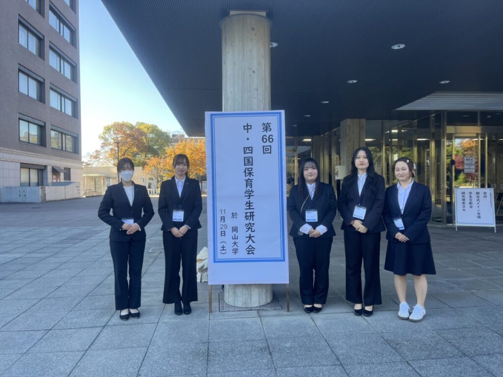 11月29日(土)に岡山大学で開催された「第66回 中・四国保育学生研究大会」に保育学生2年の5名が参加しました。32校、約900名の保育学生が岡山に集い、研究に取り組んだ成果を発表しました。