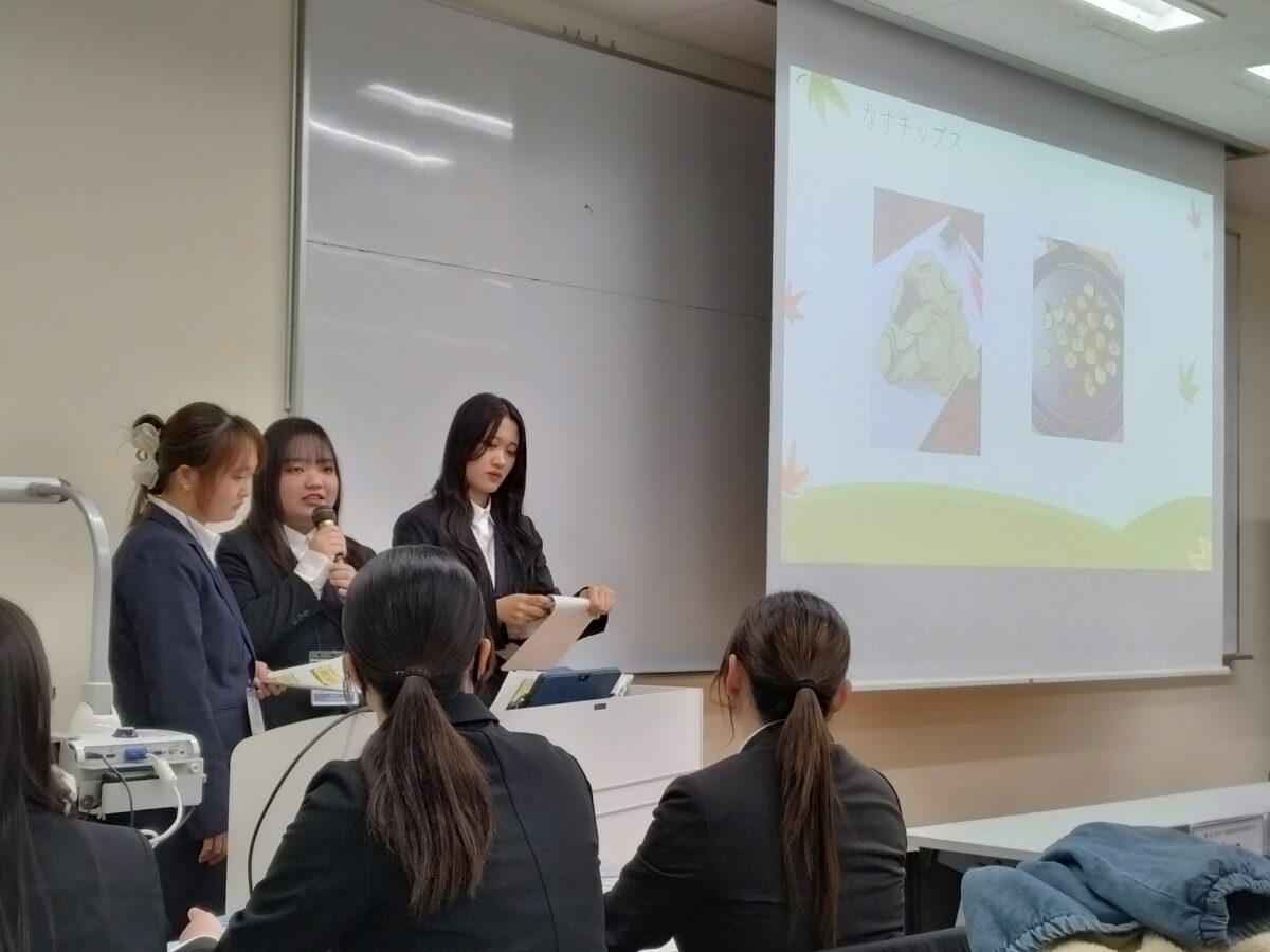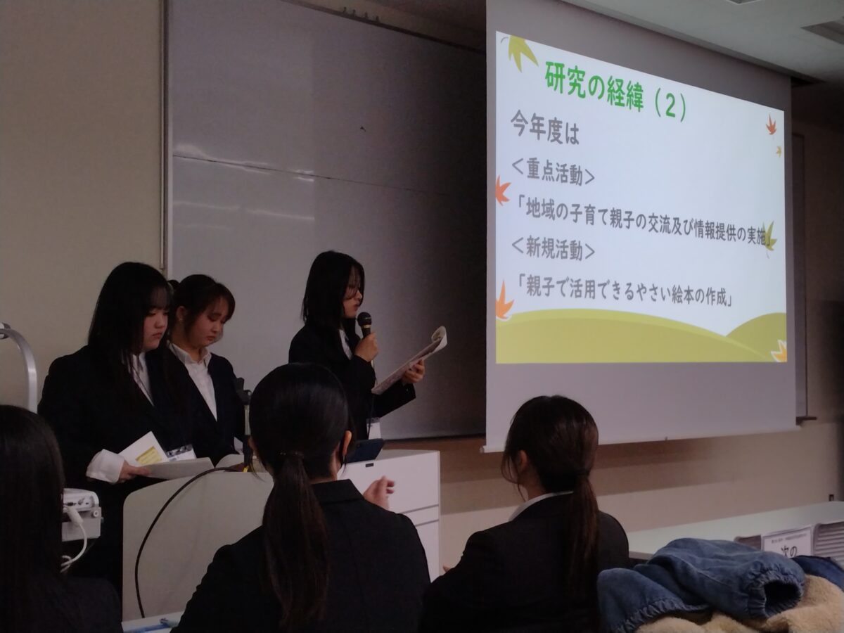 本学は、「野菜で子育て支援~地域に広げる食育活動について~」のテーマで、夏の「親子料理教室」や10月の大学祭、11月に行った地域の集会室や畑での「収穫祭」等、自分たちで企画・運営した親子活動についてまとめて発表しました。