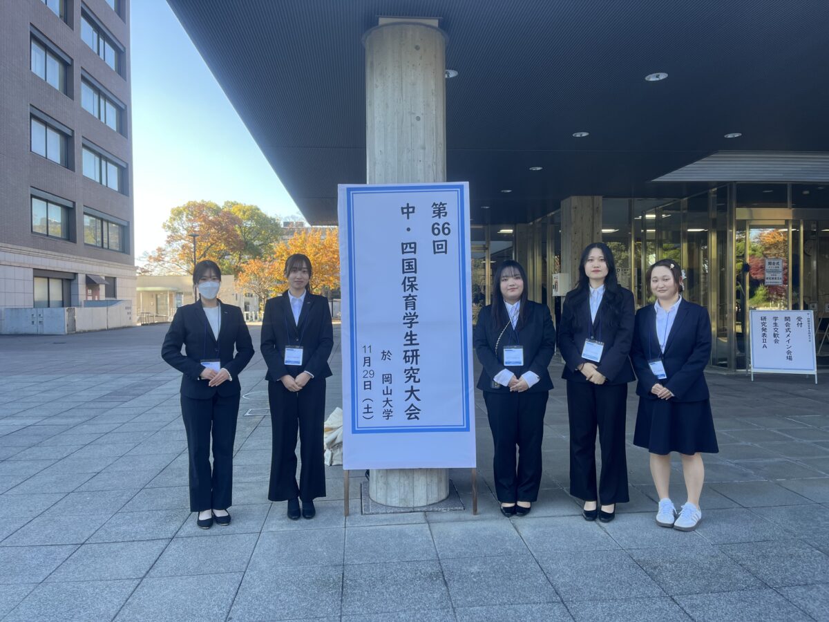 11月29日(土)に岡山大学で開催された「第66回 中・四国保育学生研究大会」に保育学生2年の5名が参加しました。32校、約900名の保育学生が岡山に集い、研究に取り組んだ成果を発表しました。