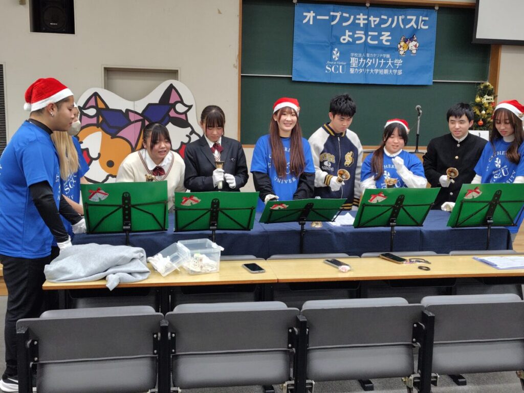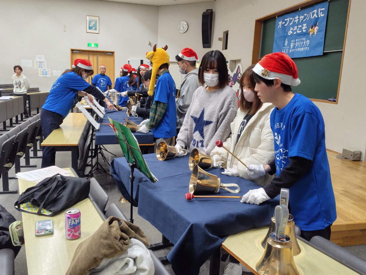 プログラム冒頭に、本学のクラブ「ハンドベルリンガーズ」による、クリスマスにちなんだ曲の演奏をお聞き頂きました。次に学科紹介を⾏い、いよいよハンドベル体験です。部員の学⽣による優しい指導の下、参加者の皆さんが⼀緒になって⾳楽を奏でました。学⽣と参加者が⼀体となり、和やかなムードで体験を⾏うことができました。