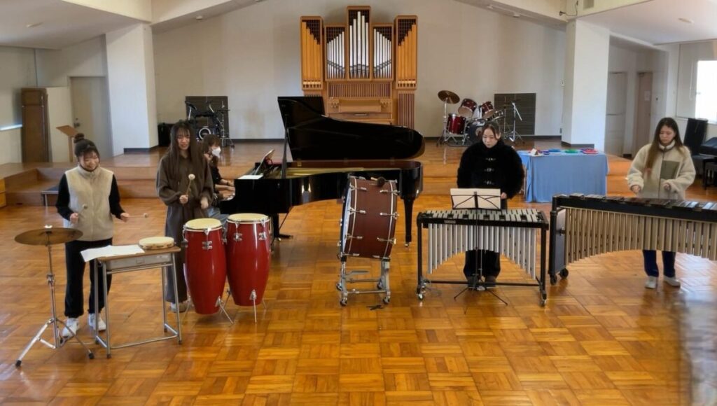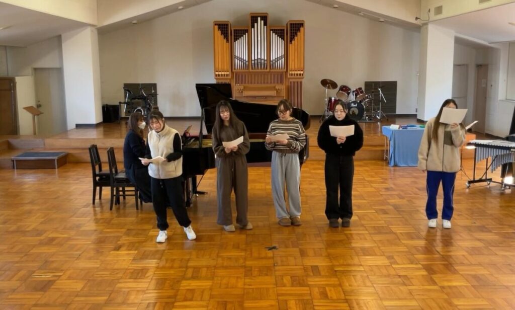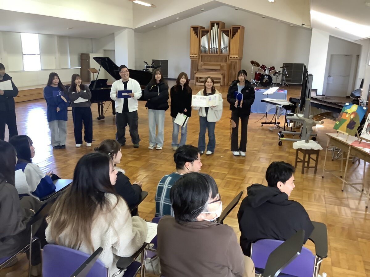 「音楽表現」のゼミでは、個々に課題に取り組んだ様子を、写真や動画を交えて発表した後、実際に合奏と合唱を披露しました。1曲は会場のみんなで卒業ソングを歌い、思わず涙ぐむ学生の姿も見られました。