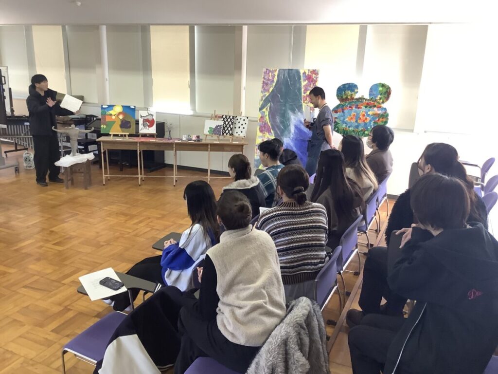 「造形表現」のゼミでは、1週間前から保育学科棟に展示していた作品について、他のゼミ生からの質問を受け、それぞれが作品に対する思いを伝えてくれました。
