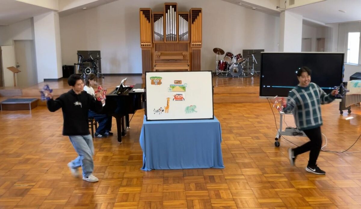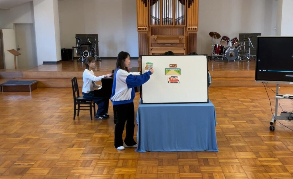 「身体表現」のゼミでは、子どもたちの前で実際に発表した際の動画を視聴した後に、他のゼミ生に向けてパネルシアターの発表を行いました。ダンスや歌を取り入れて、一般的なパネルシアターにアレンジを加えて発表しました。