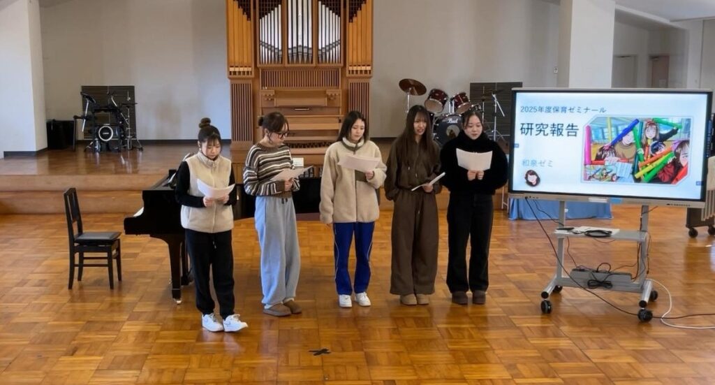 今年度から始まった「保育ゼミナール」の授業では、学生が選択したゼミに所属し、2年後期の期間にそれぞれが取り組んだ内容を発表しました。