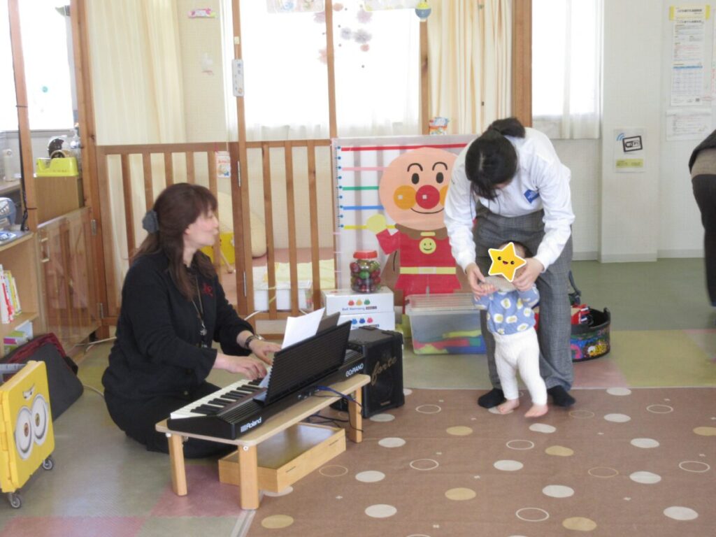 事前に申し込みのあった親子が参加してくれました。対象は0歳~3歳で、発達段階により子どもたちのできることに差はありますが、保護者の方と工夫をしながら活動を楽しみました。