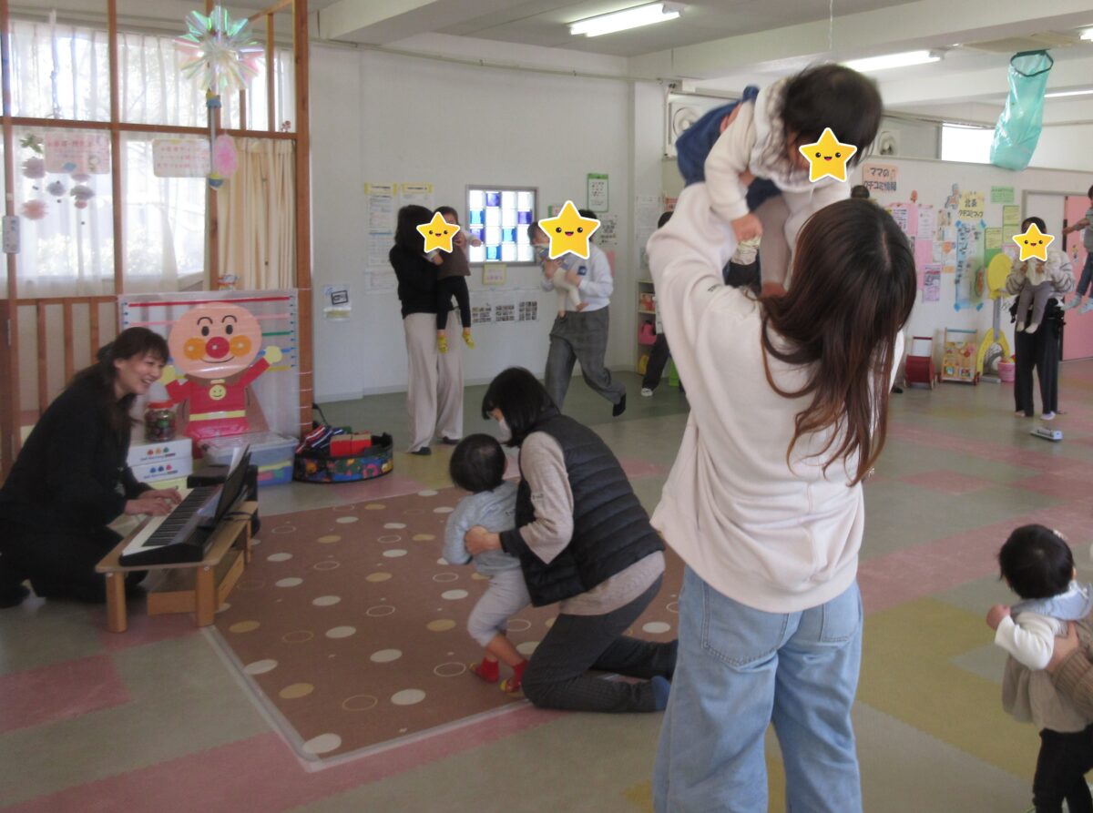 事前に申し込みのあった親子が参加してくれました。対象は0歳~3歳で、発達段階により子どもたちのできることに差はありますが、保護者の方と工夫をしながら活動を楽しみました。