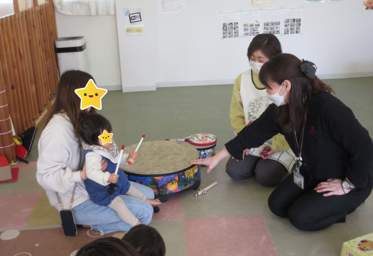 音楽に合わせてふれあい遊びや、全身を使った活動をした後、絵本の読み聞かせに合わせて、楽器で音を入れながら楽しみました。