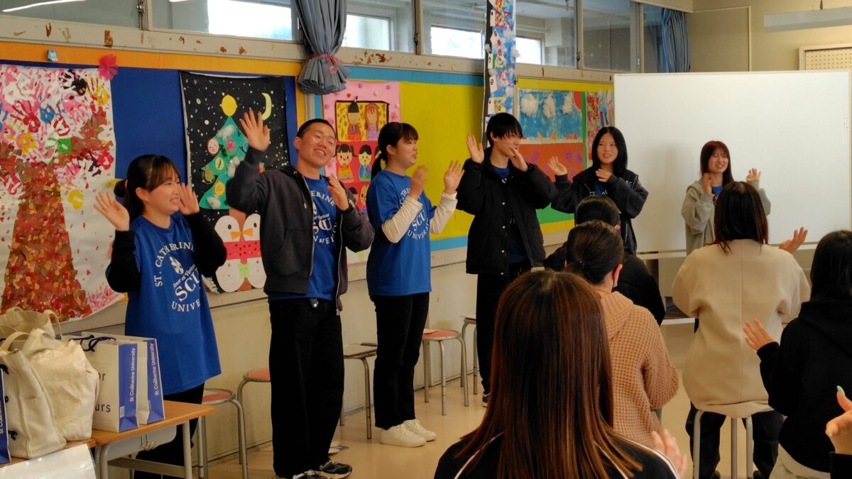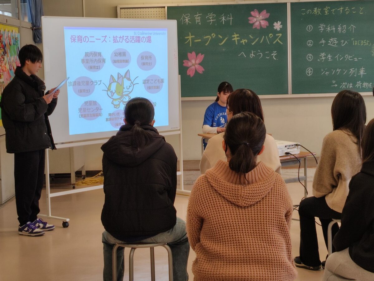学科紹介では、まもなく2年生となる在学生が、1年間の学びや学生生活、ボランティア活動について紹介しました。手遊びやじゃんけん列車など、習得した保育技術を披露し、参加者と一緒に体を動かしました。
