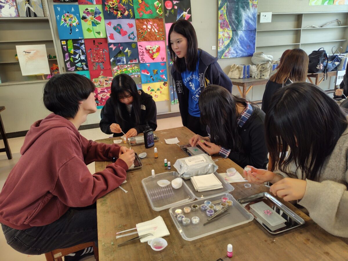 体験授業では、レジンを使った季節のキーホルダー作りを行いました。参加者はそれぞれに好きな色やラメを選び、細かな作業に集中して取り組んでいました。制作の合間には在学生との会話も弾み、交流を深める時間となりました。
