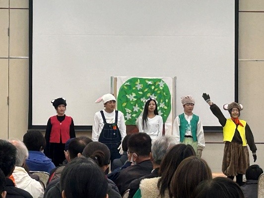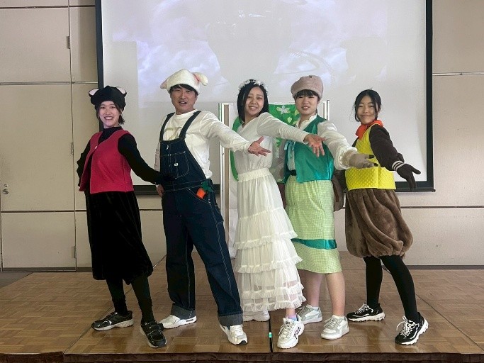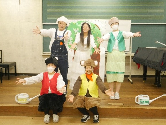 2月に開催された松山市主催の第10回地域力パワーアップ大会に出演するため、昨年12月に保育学科の1,2年生の有志5名が集結しました。時間のない中、みんなでアイデアを出しながら、衣装や小道具を作り、練習を重ねてきました。大会前の昼休みには、カタリナ子育て広場「ぽけっと」で利用者やスタッフ、保育学科1年生の前で発表しました。1歳前の子どもが音楽に合わせて体をゆらし、最後までしっかり見てくれるなど、5人の楽しそうな演技に子どもも保護者も惹きつけられていました。