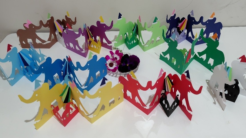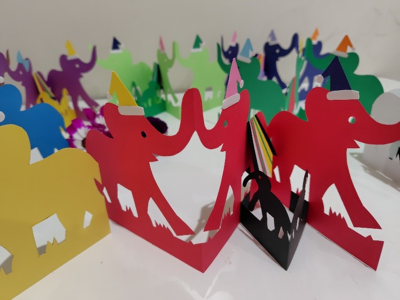 先日、初対面の初老の方が、本学を訪問され、色とりどりの象の切り紙を届けてくださいました。保育を学ぶ学生の皆さんにぜひ見てもらいたいとの思いで、ご自身で丁寧に作られたものです。細部まで工夫され、配色にも心が配られており、楽しみながら制作された様子が伝わってきます。現在、保育学科棟のエントランスに飾っています。