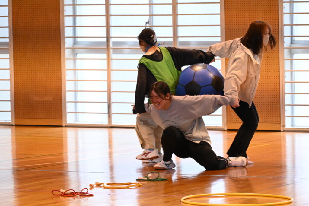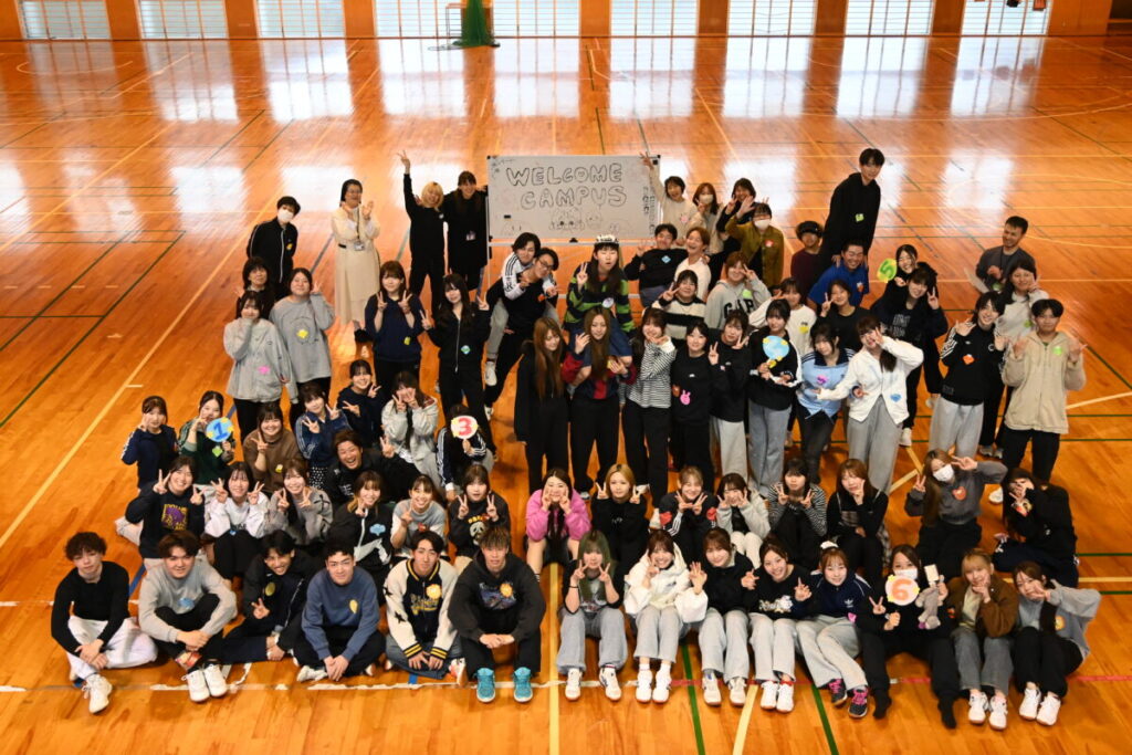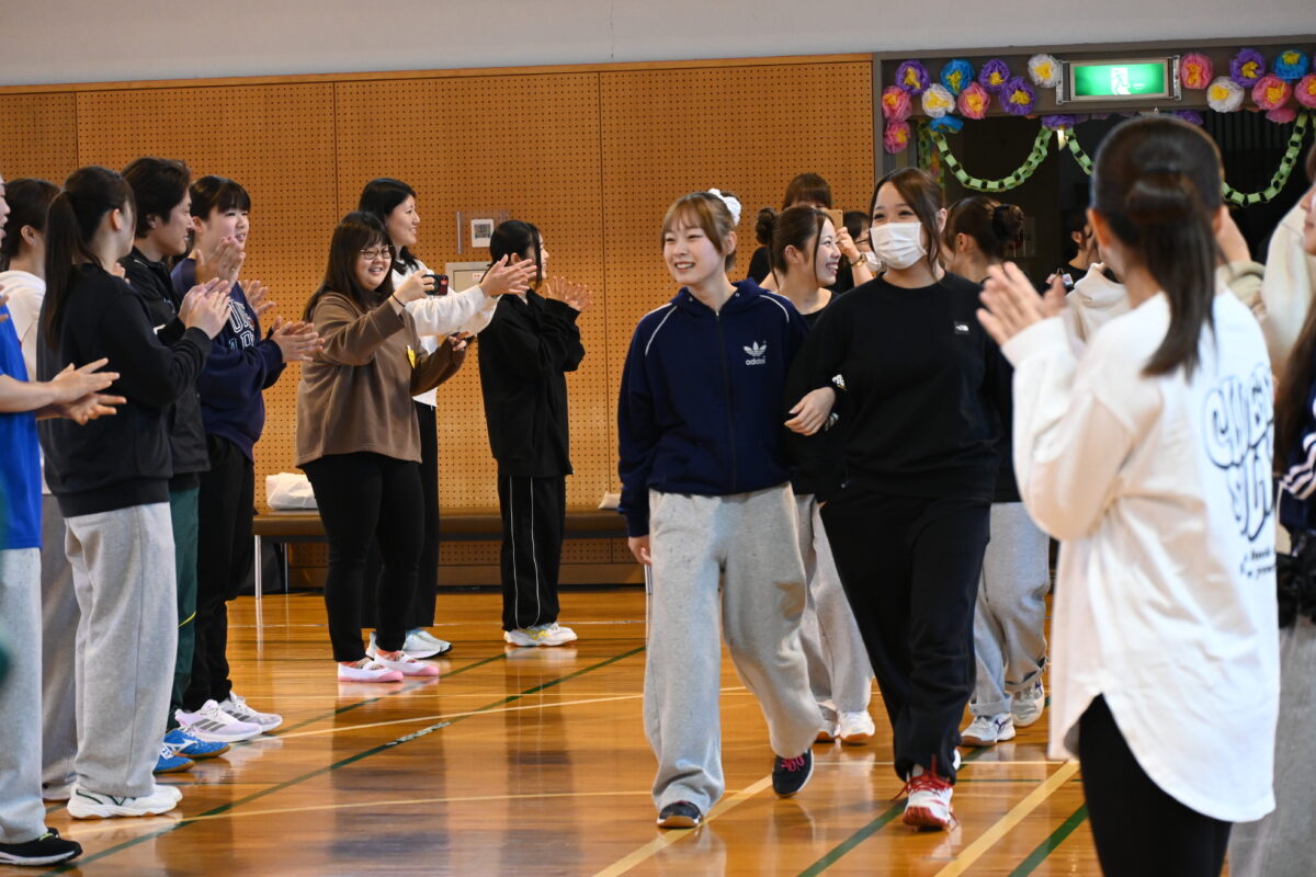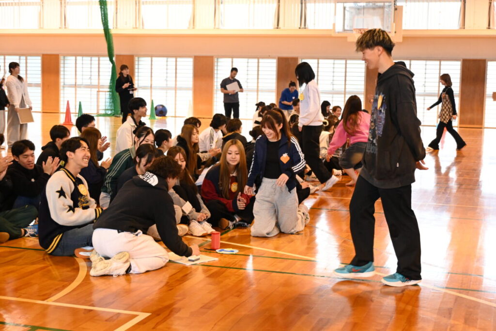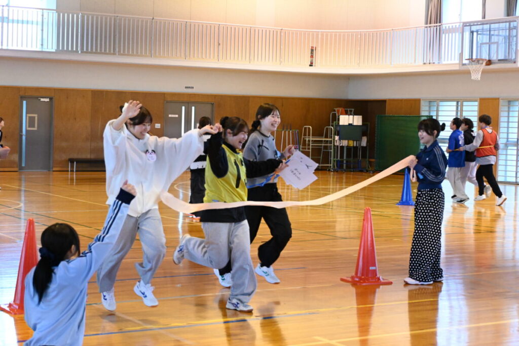 初めに、保育学生の一日の様子を学生が編集した動画で紹介。次に、保育学科生らしく「エビカニクス」で準備体操を行い、チームに分かれて「ジェスチャーゲーム」や「借り人競争」を行いました。