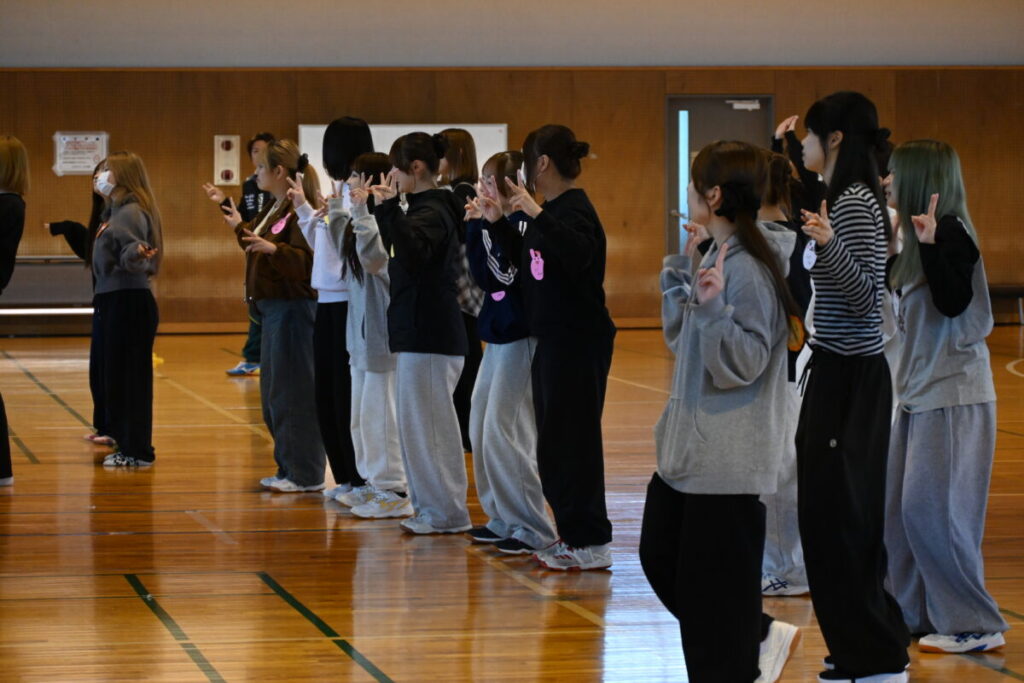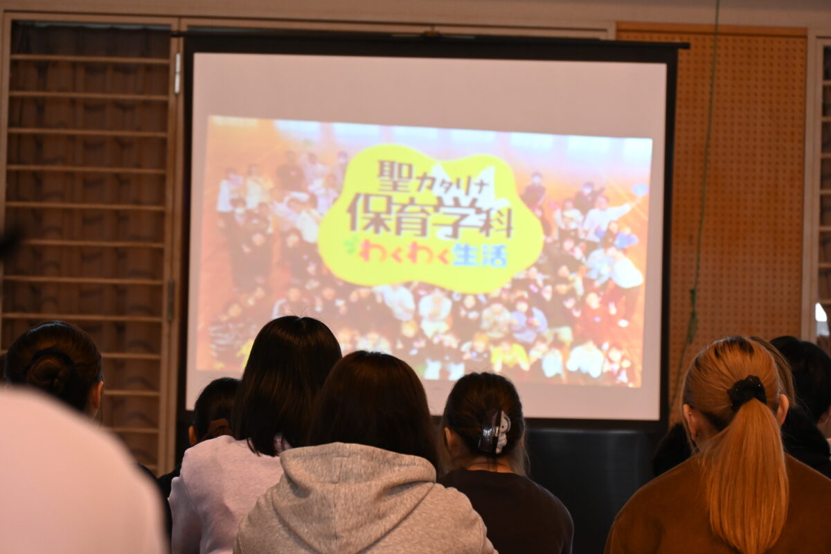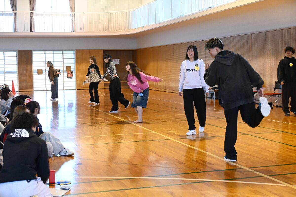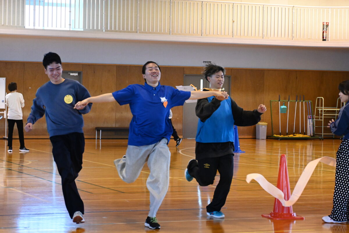 初めに、保育学生の一日の様子を学生が編集した動画で紹介。次に、保育学科生らしく「エビカニクス」で準備体操を行い、チームに分かれて「ジェスチャーゲーム」や「借り人競争」を行いました。
